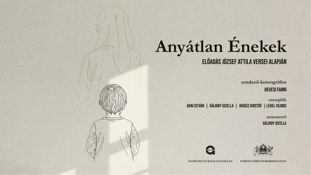 Az Anyátlan énekek József Attila verseinek testben, és mozdulatban megszülető világa. Egy fizikai színházi utazás az anyahiány, a szeretetvágy és az önkeresés rétegein át- ott, ahol a szó néha kevés, a mozdulat folytatja a mondatot.